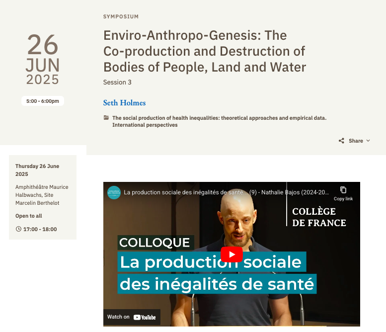 June 26, 2025: “Enviro-Anthropo-Genesis: The Co-production and Destruction of Bodies of People, Land and Water” at the Collège de France The social production of health inequalities: theoretical approaches and empirical data. International perspectives symposium